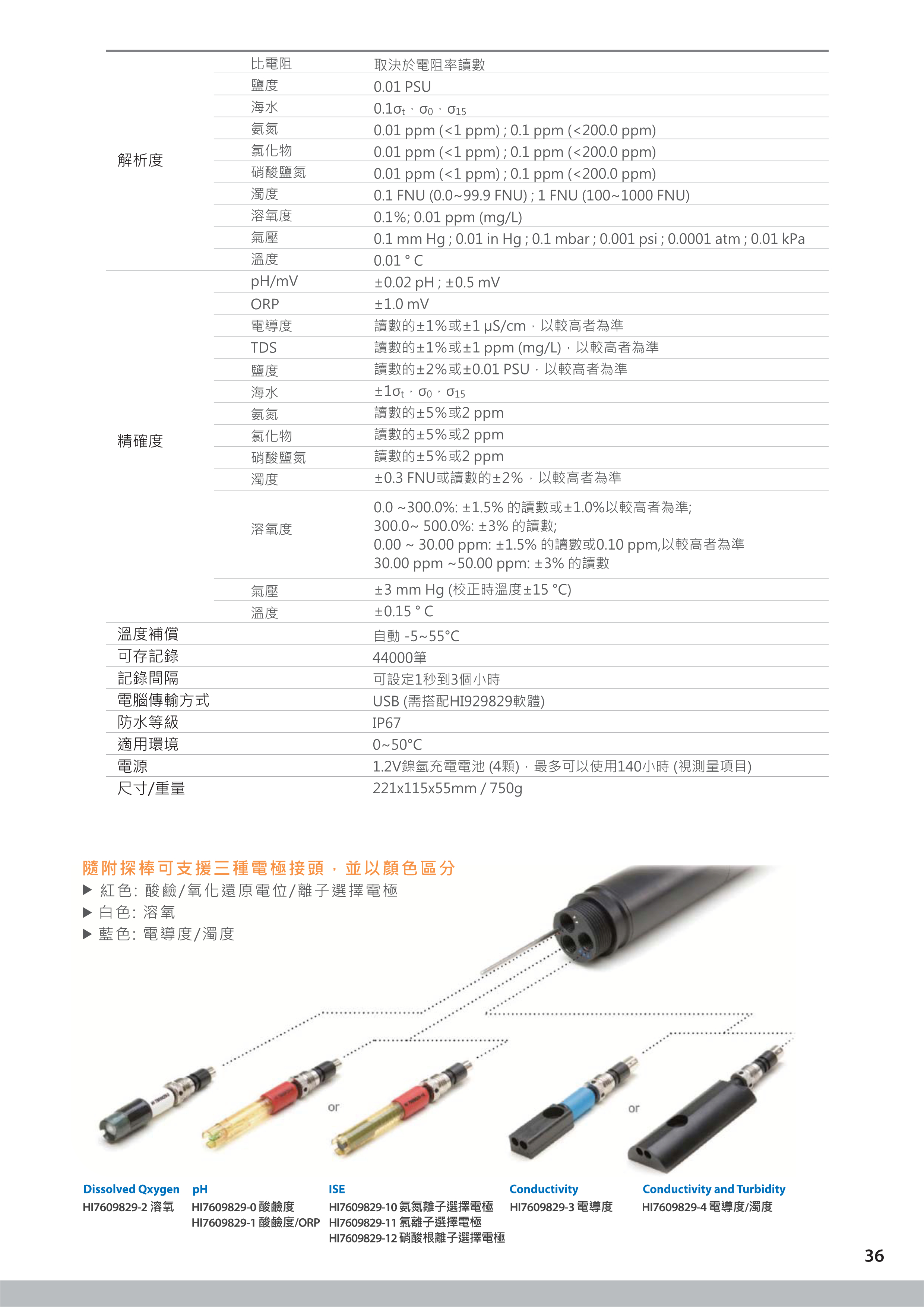 儀器本體 IP67 級防水,探棒 IP68 級防水,適合於水中和濕潤環境中使用。