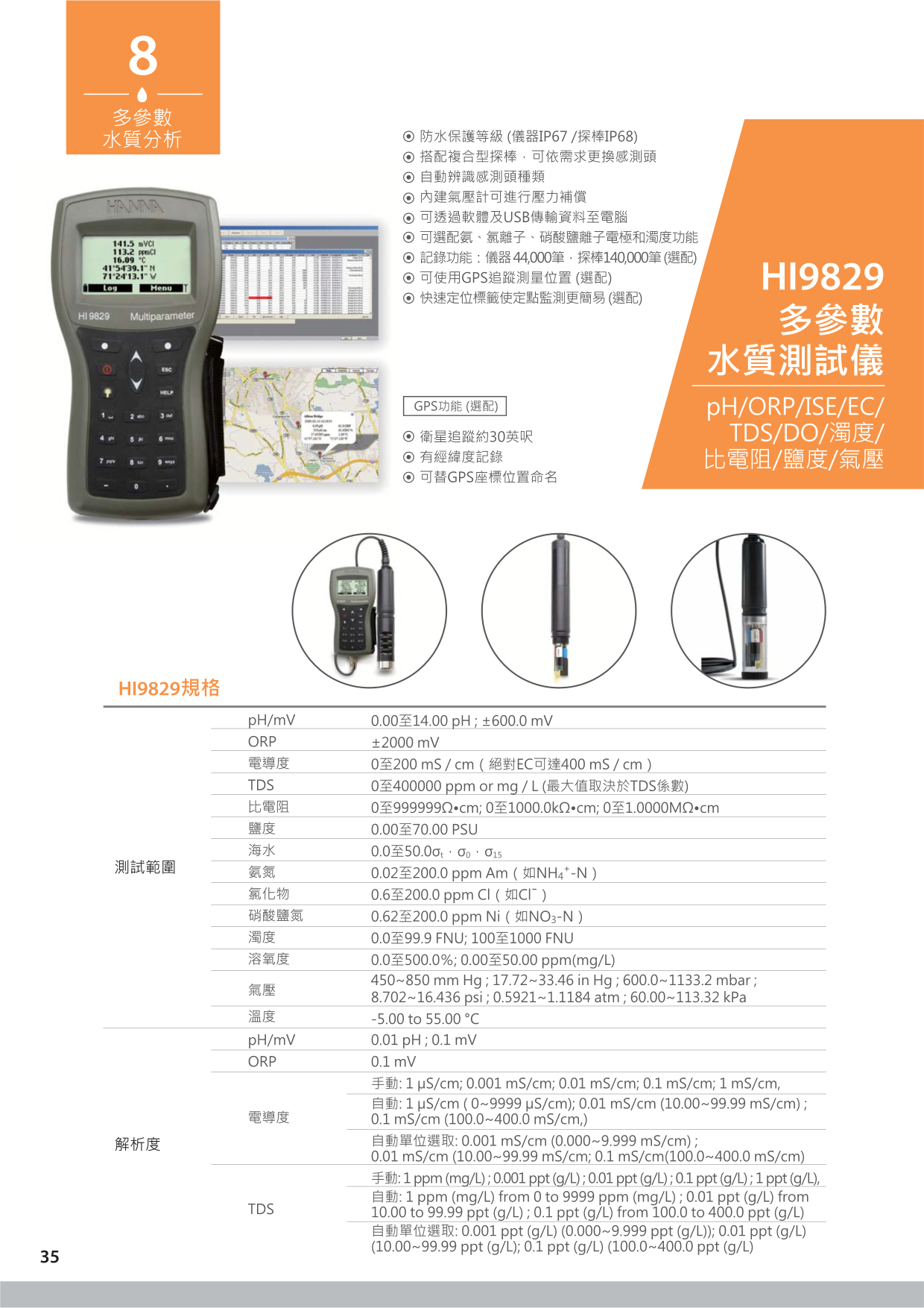HANNA Instruments 手持式多參數水質測試儀 - pH/ORP/ISE/EC/TDS/DO/比電阻/鹽度/氣壓濁度/氨氮/硝酸鹽/氯化物/GPS HI9829