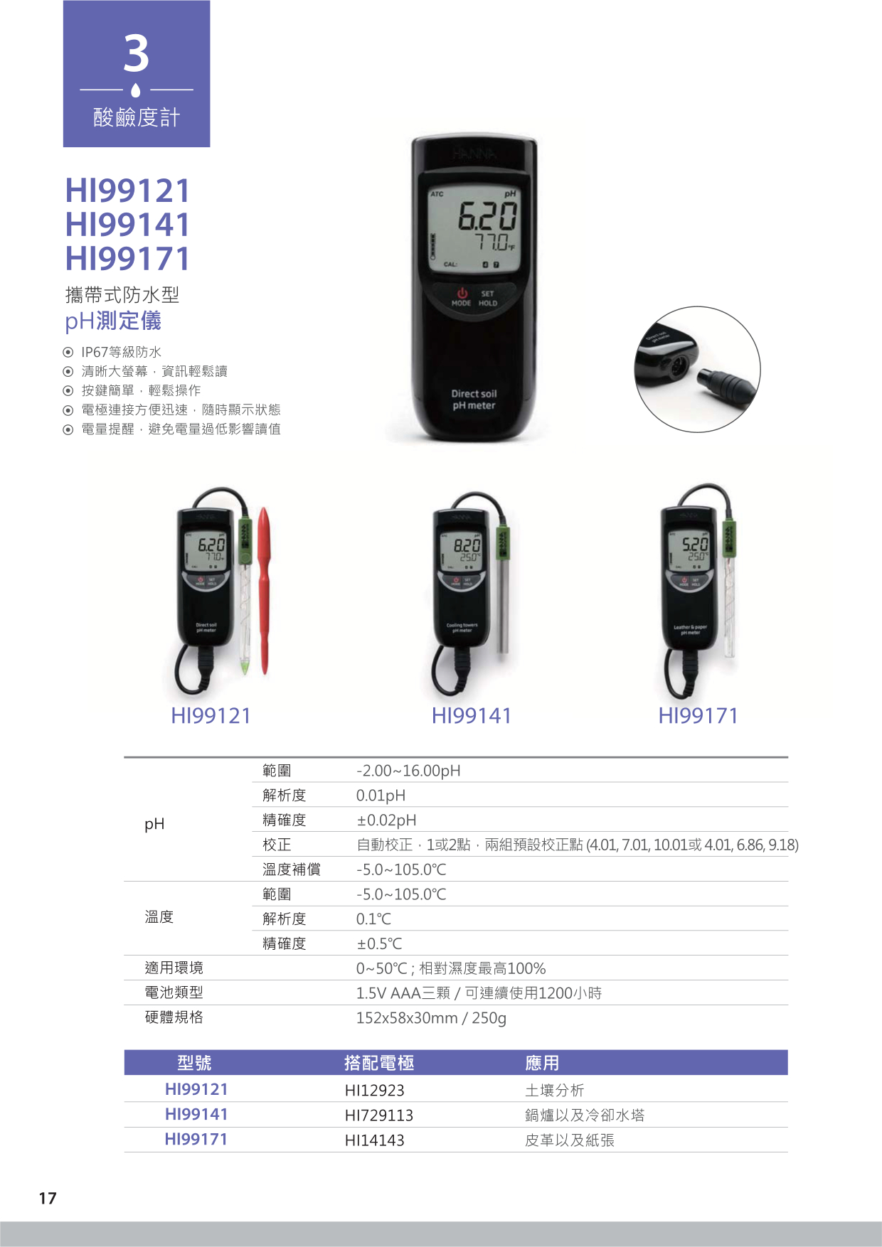 • HI99121土壤/HI141鍋爐及冷卻水/HI171皮革及紙張-防水PH酸鹼度計